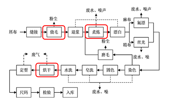 紡織印染的主要流程分為3步:前處理、染色印花、后收拾,其主要工序有燒毛、退漿、煮煉、漂白、絲光、定型、烘干和染色等。鍋爐是紡織生產(chǎn)線設(shè)備中的一員,用來帶動烘干等設(shè)備,并在壓片、燒毛、退煮漂、定型、染色等環(huán)節(jié)中供熱。